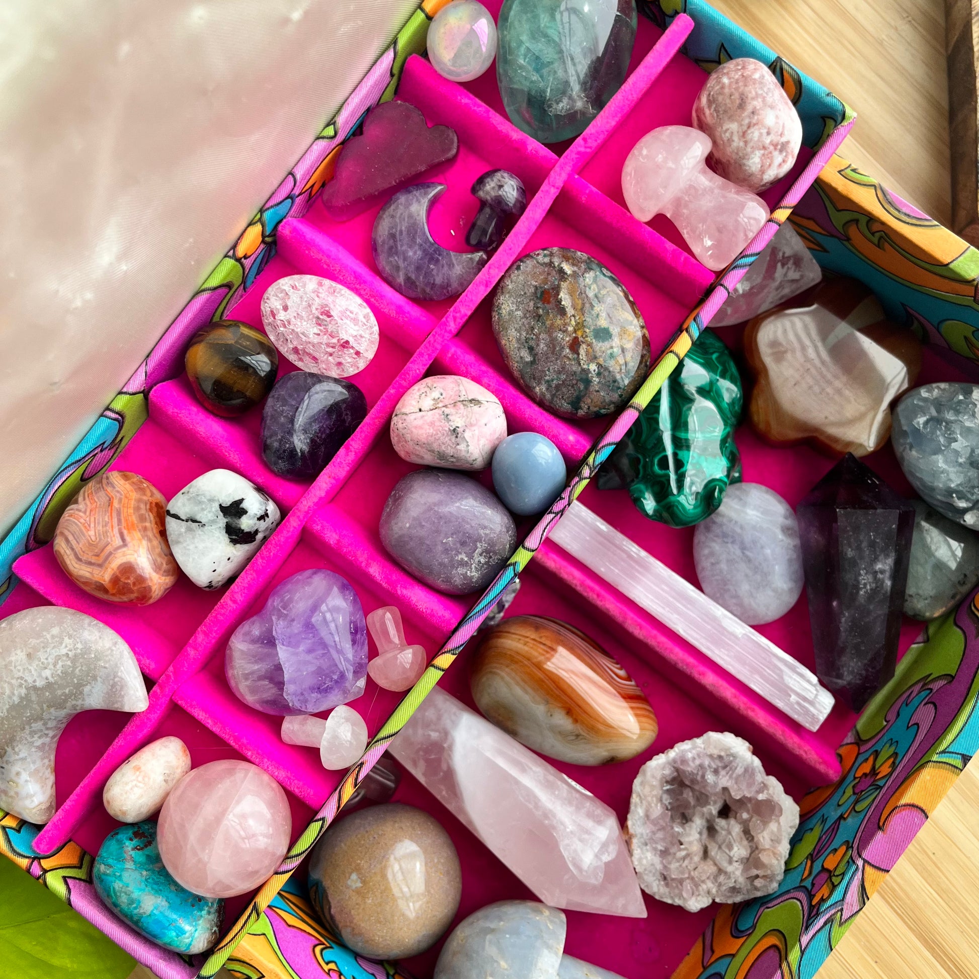 This groovy bundle is full of an array of crystal carvings, tumbles and raw stones! A flower childs dream. This groovy jewelry box design is a rare find and Im so happy i was able to find it for you <3
