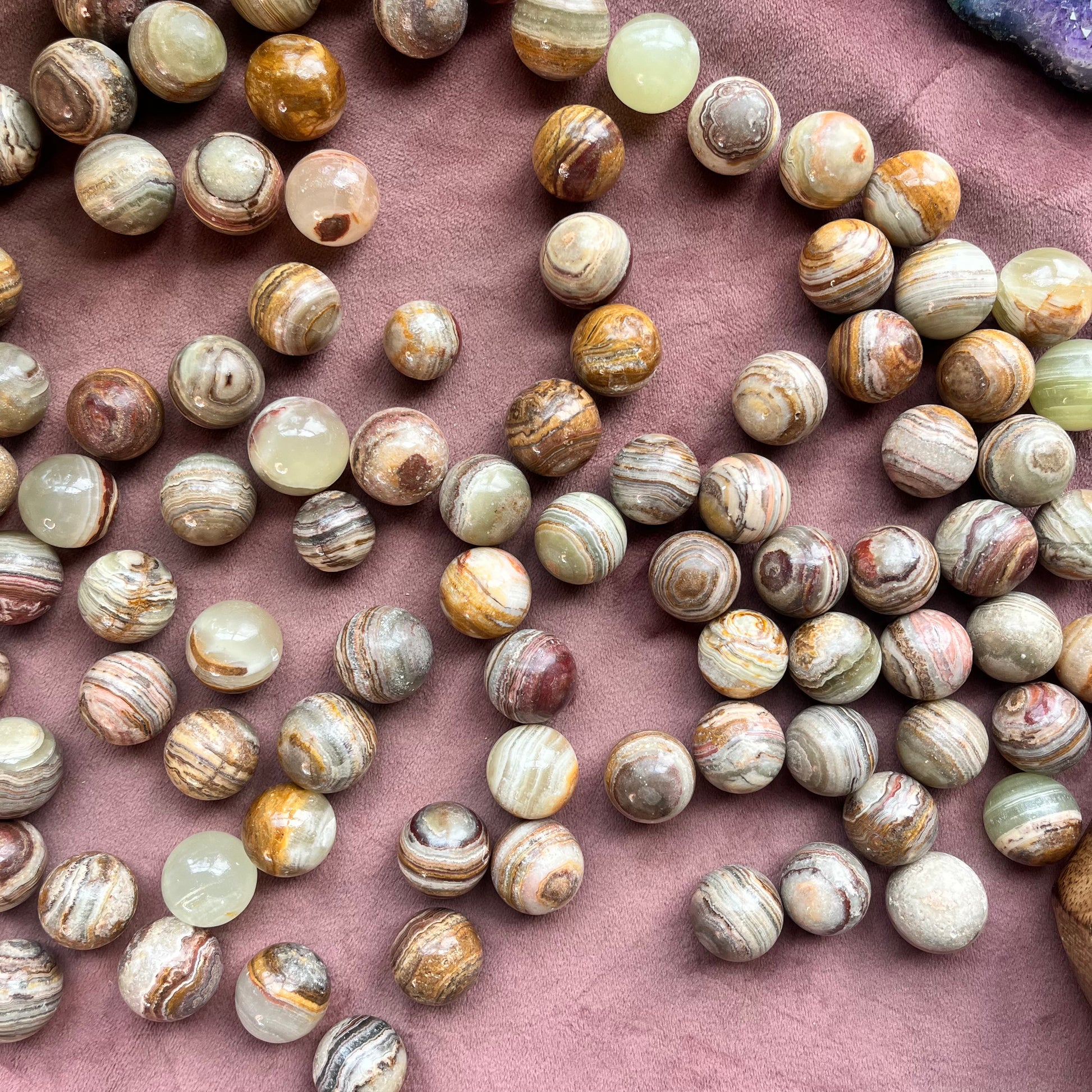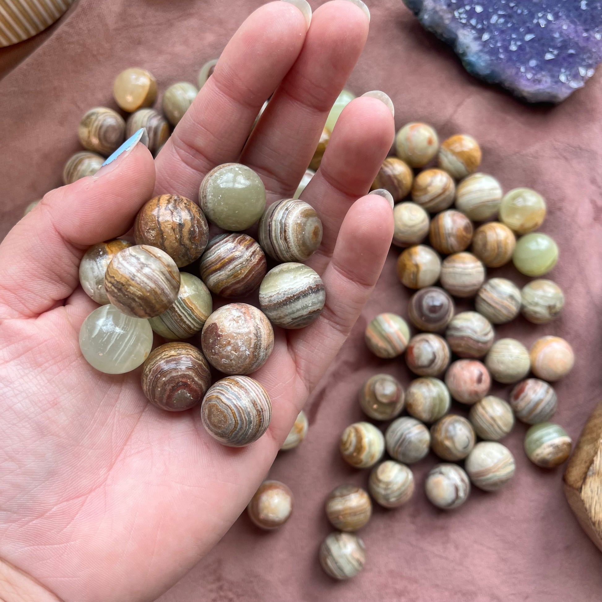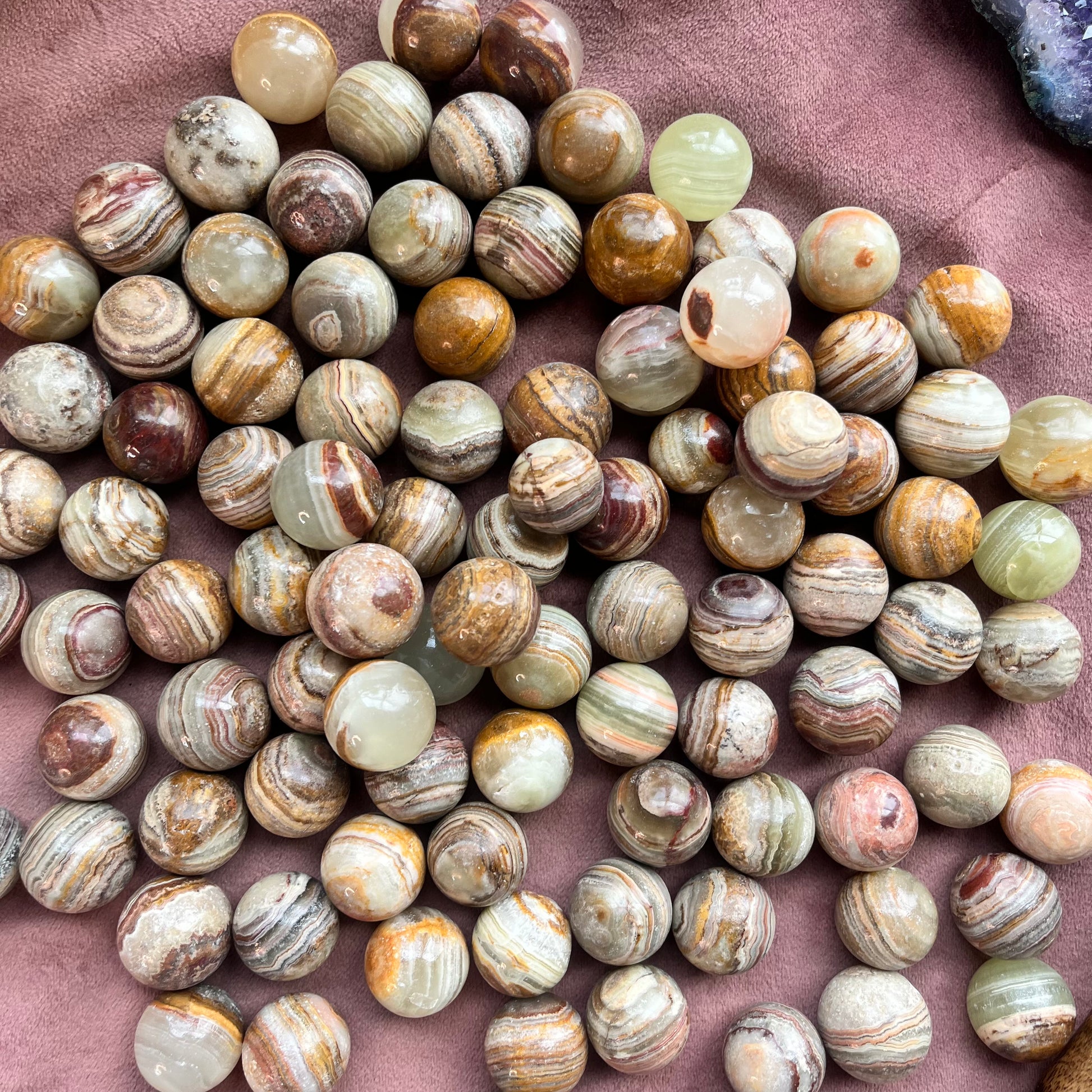 Often referred to as banded onyx, these lil gemstones show off their unique patterns and vibrant colors. Each handpicked sphere is a miniature work of art, unique in its own! Discover the harmonious energy and beauty these spheres bring to your crystal collection