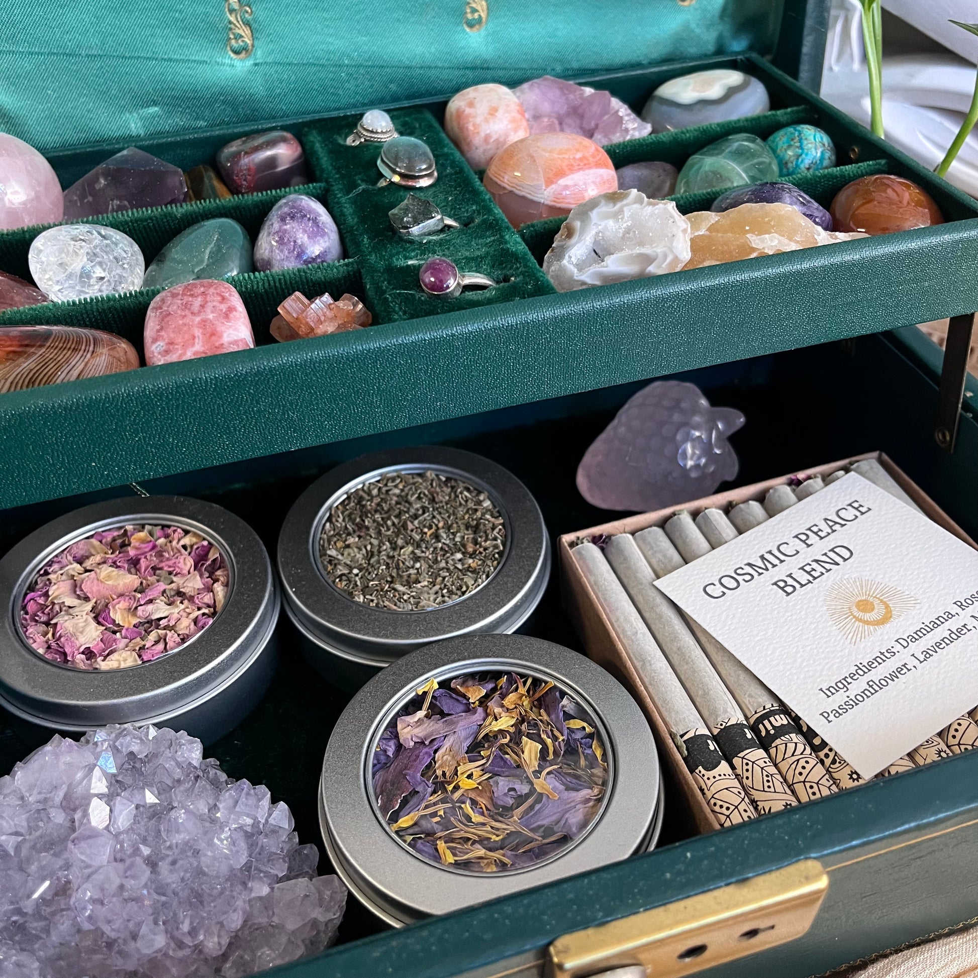 This warm green bundle is filled to the brim with crystal offerings alongside 3 smokeable herbs and a 30 pack of our cosmic peace smokes! This bundle also includes 4 sterling silver rings (size 8 and size 7).